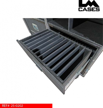 The case featured 4 heavy duty drawers to hold 44 iPads. Each drawer is built from ½” Baltic Birch plywood, mounted on Accuride glides and finished with black texture coating. The iPad’s are separated via removable ½” black marine grade plastic dividers.