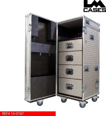 The interior features top storage for a printer, behind the printer is a 6 outlet power strip and a 5 outlet 40w USB charging hub. All power components are wired to a retractable 30ft cable reel wired to a male Edison plug which alleviates the need to carry an extension cord to power the case. All powered products we installed by the LM Cases Custom Integration department. Below the printer section are 5 drawers built out of Baltic Birch and mounted on HD Accuride drawer glides. Each drawer face is made out of the same diamond plate laminated plywood as the case exterior,