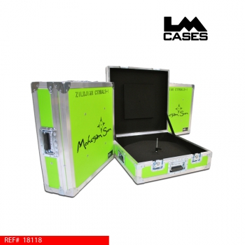 This case was built for the back line division of Mohegan Sun Casino. The case is built out of 3/8" plywood and is outfitted with Neon Green laminate. The case features a quick-lock mechanism to hold the cymbals down, this allows you to push a button and release the holder. This is much quicker than threading a typical nut over a threaded rod. The design of this case is special because it was made to protect all aspects of the cymbal. The threaded rod has a nylon sleeve over the bottom half so the threads will not dig into the cymbal hole resulting in "key-holing". We also cut circular pieces of black ozite carpet with thread holes in the center to prevent the cymbals from banging into each other during transport.