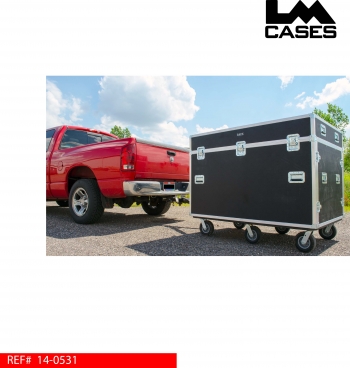 The case shell is built out of 1/2" plywood and features an internal steel structure to provide rigidity during transport. A custom built hinged A-frame hitch assembly was built by LM to provide a quick connect interface to the towing vehicle. The A-frame hitch assembly is mounted to the case via 2 custom welded brackets and secured via pins allowing it to be removed from the case if needed. In storage, the hitch assembly is raised and secured to the exterior case via a custom welded bracket and a removable safety pin. The case rides on 6 - 8" field casters; 4 swivel 360 degrees while 2 remain fixed for easy towing.